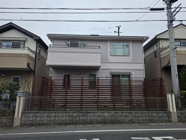 ローズグレイとベビーピンクの外壁塗装により、住宅のデザインがより引き立つ外観に。屋根や付帯部のメンテナンスに加え、ウッドフェンスの塗装も行い、外観全体に統一感のある仕上がりとなりました。