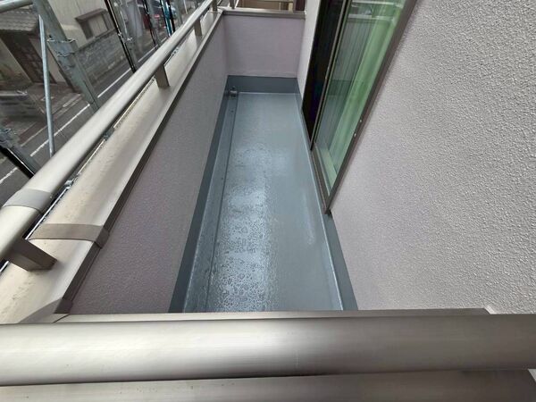 ベランダ床にはトップコート施工を行いました。防水層を紫外線や雨風から保護し、美観の回復と耐久性の維持につながります。