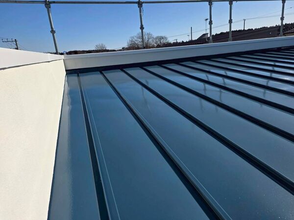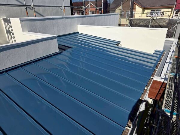 屋根にはアステックペイント「リファインJYMSIR」、カラーは「マウンテンブルー」を採用しました。