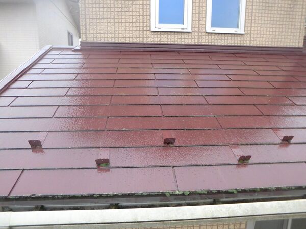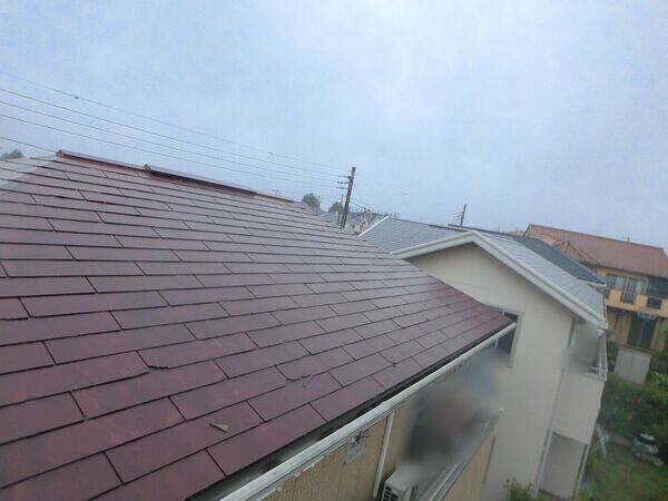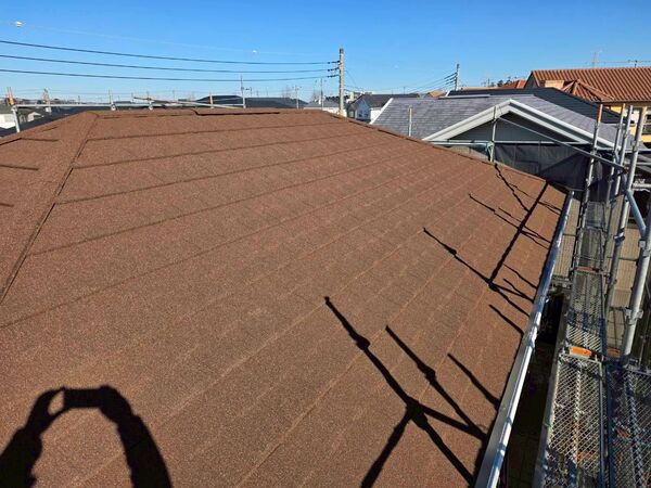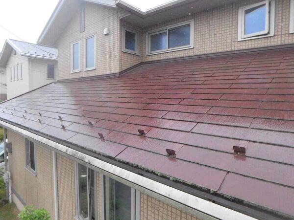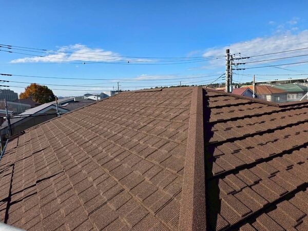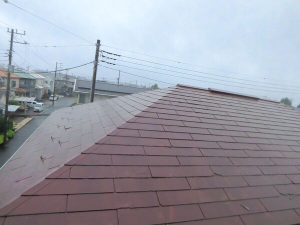 屋根全体に色あせや経年劣化が見られ、特に防水性能の低下が懸念される状態でした。