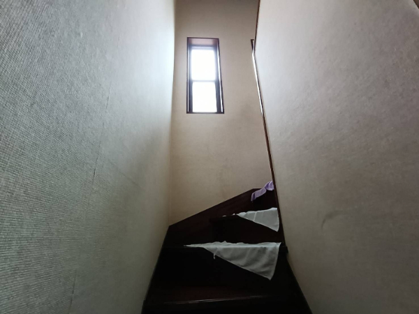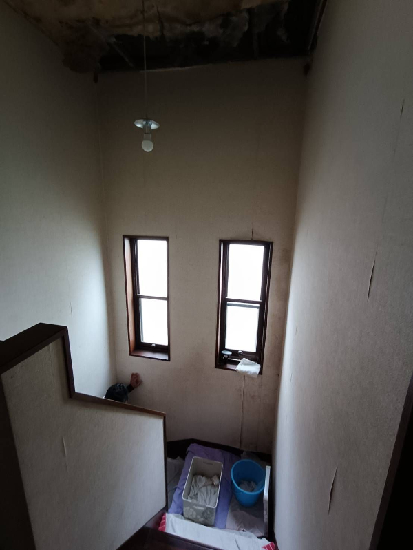 室内は天井が一部はがれおちており、段ボールなどで塞いでありました。階段にバケツやタオルを敷いて雨漏りをしのいでいる状態でした。