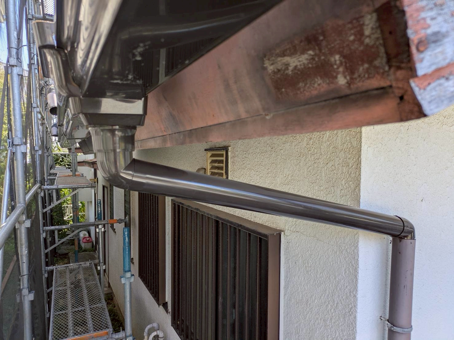 穴のあいた軒天の板金補修や雨樋修理はサービスで行わせていただきました。
