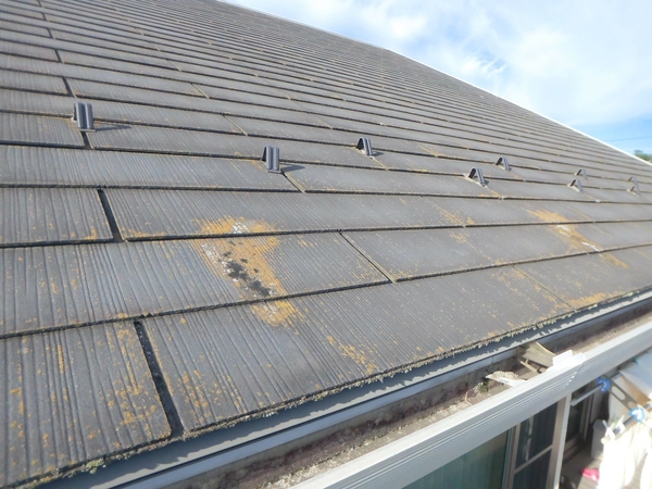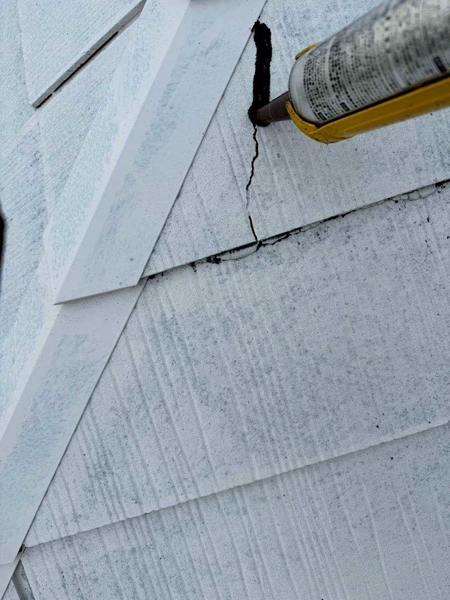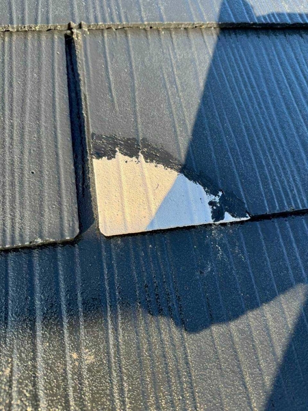 高耐久塗料の性能を十分に発揮させるため、塗装前には屋根の状態を細かく確認し、写真で確認できるような欠けやひび割れについても必要な補修を行いました!