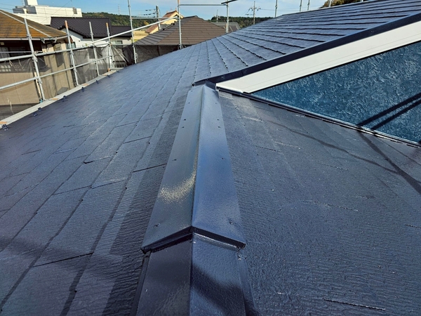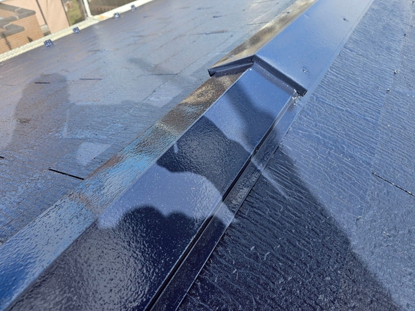 棟板金まわりや屋根の重なり部分まで丁寧に塗装され、細部までしっかりと仕上げています。
